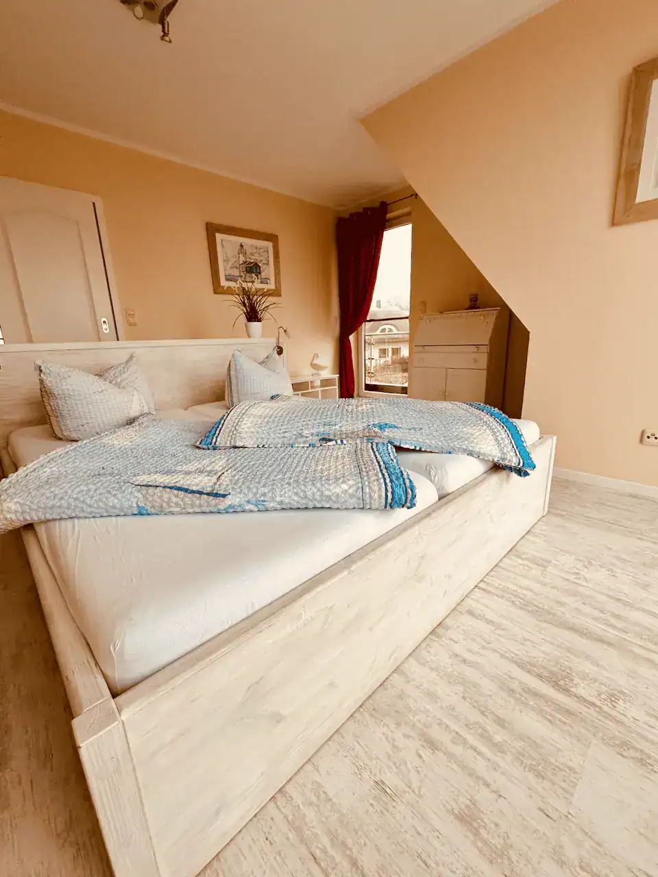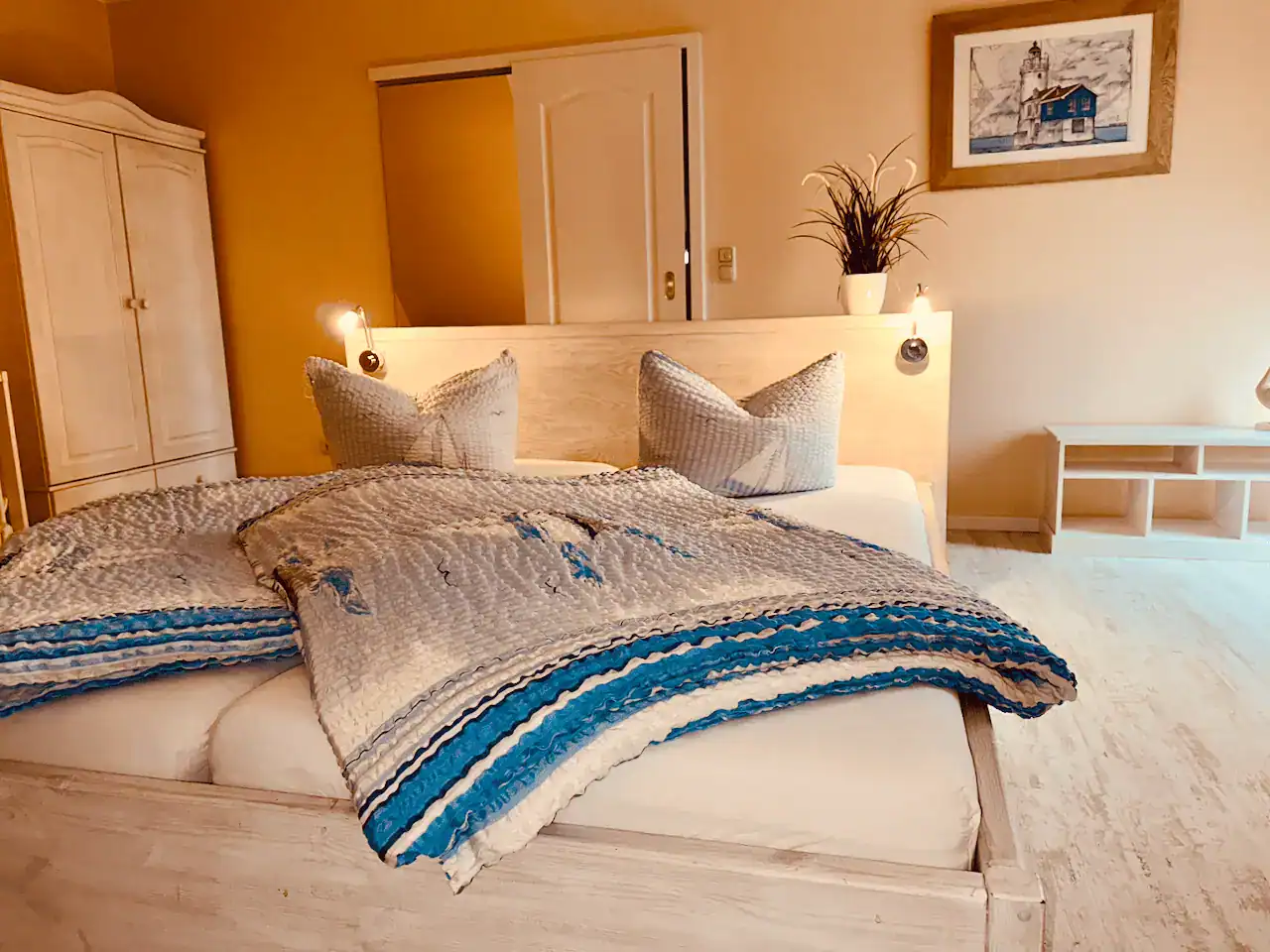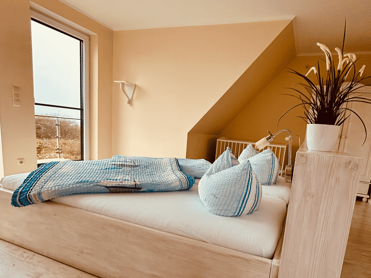 Das Schlafzimmer bietet einen behaglichen Rückzugsort mit einem großen, komfortablen Doppelbett für erholsame Nächte. Für unsere kleinsten Gäste steht ebenfalls ein Gitterbettchen zur Verfügung. Ein geräumiger Kleiderschrank sorgt für ausreichend Stauraum, während die Fussbodenheizung zu jeder Jahreszeit ein angenehmes Raumklima schafft – perfekt zum Abschalten und Wohlfühlen.